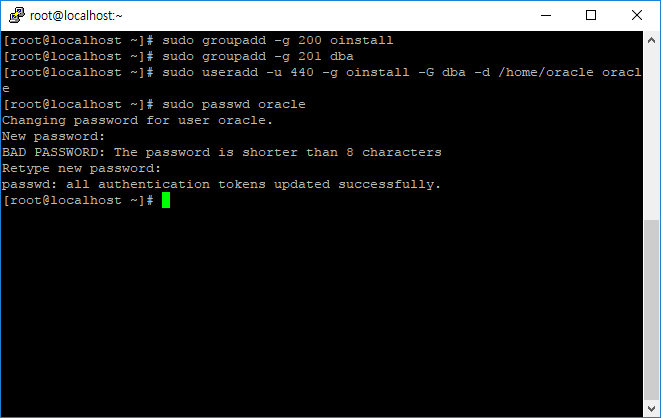 $ sudo useradd -u 440 -g oinstall -G dba -d /home/oracle oracle