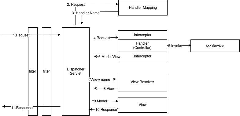 FrameworkServlet은 HttpServlet를 상속하고 있다. DispatcherServlet은 FrameworkServlet를 상속하고 있다. 이말은 즉슨 DispatcherServlet이 FrontController라는것이다. 다음은 요청후 실행 순서를 설명한것이다.