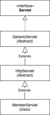위에서 설명한 Servlet들의 상속 구조는 다음과 같을 것이다. 개발자가 정의한 MemberServlet이 구현한 service를 서블릿 컨테이너가 실행할 것이다. 만약 service가 아닌 method 방식으로 처리하고 싶다면 해당 HTTP Method 방식을 구현하면 된다.