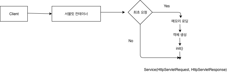 - 서블릿 컨테이너는 클라이언트로 부터 처음 요청이 들어오면 현재 실행할 서블릿이 최초의 요청인지 판단하고 없으면 해당 서블릿을 새로 생성한다. 이작업은 최초 1회만 일어난다.