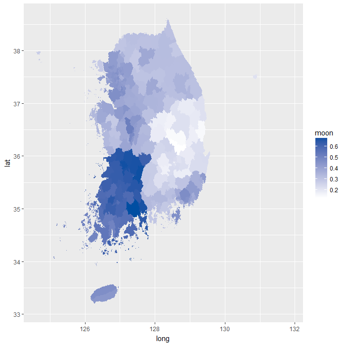 p <- ggplot() + geom_polygon(data=korea, aes(x=long, y=lat, group=group, fill=moon)) p + scale_fill_gradient(low='white', high='#004ea2')