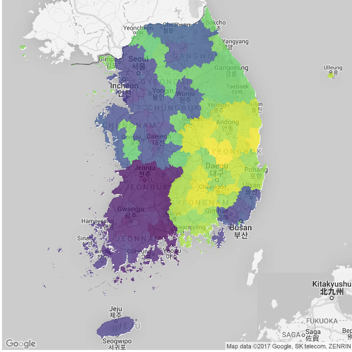 이제 실제로 색을 칠할 차례. 문 대통령이 어디서 얼마나 지지율을 얻었는지 한번 색을 칠해 보겠습니다.