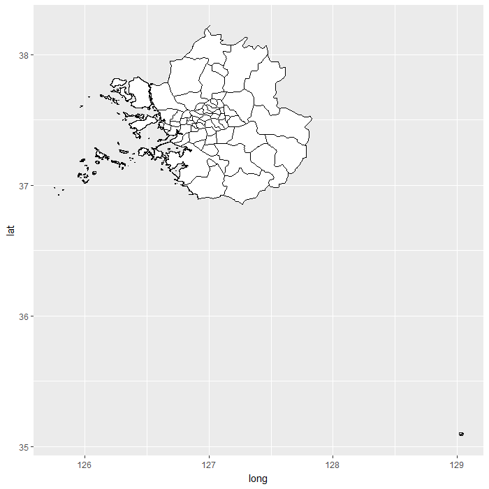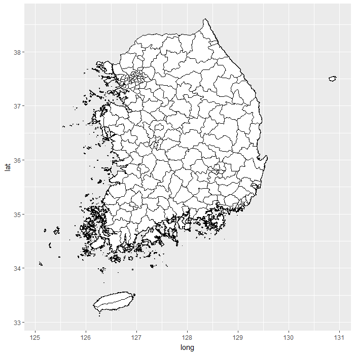 korea <- shapefile('TL_SCCO_SIG.shp') ggplot() + geom_polygon(data=korea, aes(x=long, y=lat, group=group), fill='white', color='black')