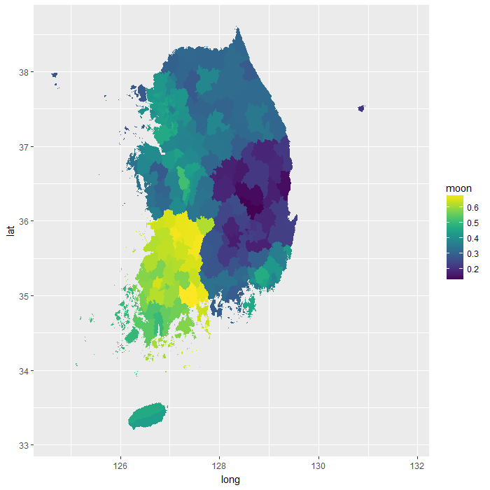 ggplot() + geom_polygon(data=korea, aes(x=long, y=lat, group=group, fill=moon))