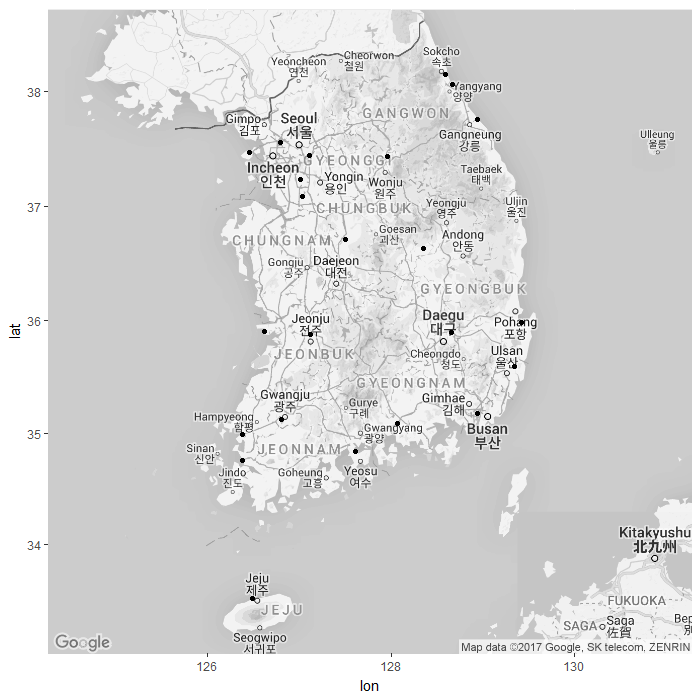 잘 들어왔네요. 이제 ggplot2 사용법을 알아볼 차례가 됐습니다. 일단 다음 줄을 한번 입력해 보세요. 그러면 지도 위에 점을 찍습니다.