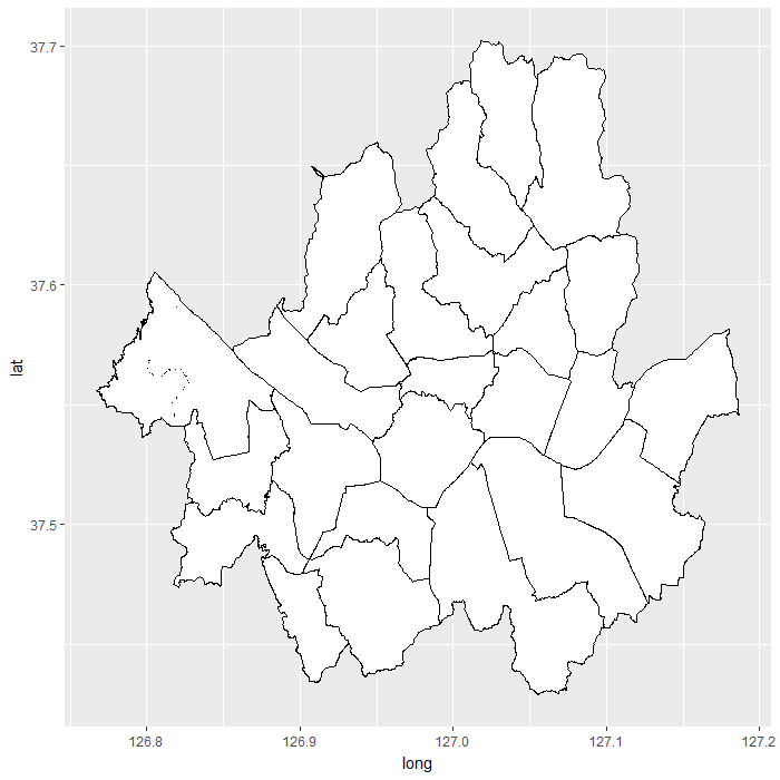 ggplot() + geom_polygon(data=seoul_gadm, aes(x=long, y=lat, group=group), fill='white', color='black')