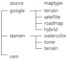 get_map은 이렇게 구글 (지형·terrain) 지도를 가져오는 게 기본. source 속성을 사용하면 스타멘(stamen) 디자인에서 만든 지도하고 (오픈 소스 지도 서비스) 오픈스트리트맵(osm·Open Street Map)도 가져올 수 있습니다. 또 한 업체에서도 서로 다른 디자인(maptype)을 마련하고 있습니다. 기본형을 모두 풀어 쓰면 아래처럼 나옵니다.