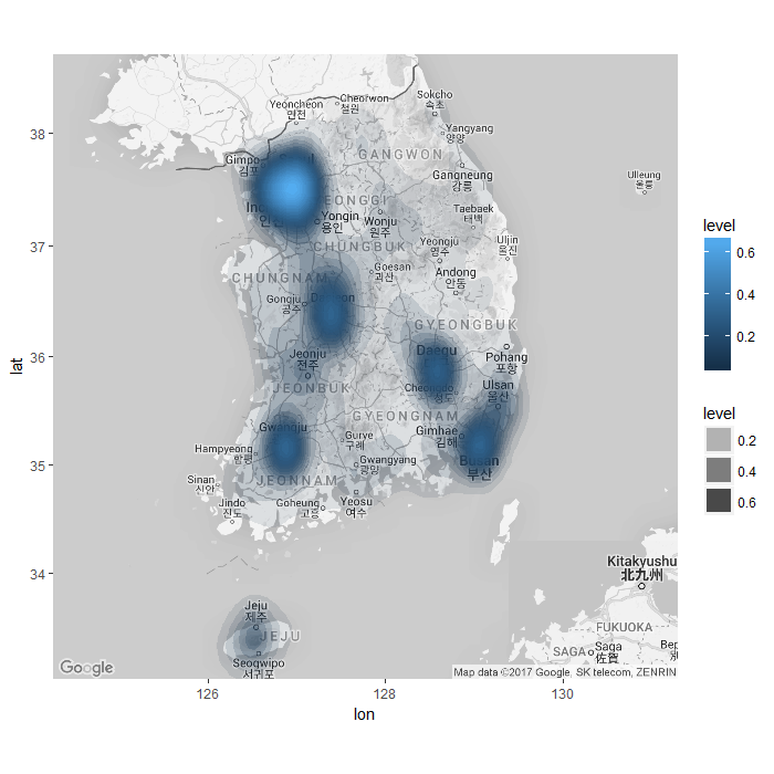 ggplot2는 ggplot() 함수를 바탕으로 여러 레이어(layer)를 겹치는 방식으로 작동합니다. 이번에는 원래 ggplot()이 들어가야 할 자리에 ggmap()이 대신 들어간 것뿐입니다.