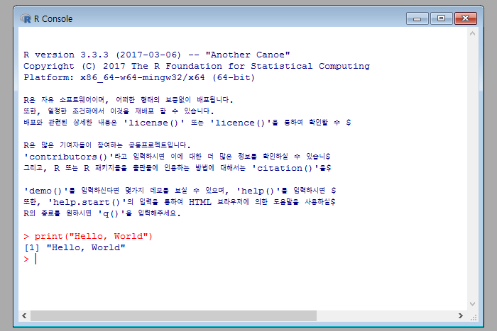 R가 뭔지 낯선 분도 계실 겁니다. R 공식 홈페이지를 통해 "R는 통계 계산과 그래픽에 활용하는 무료 소프트웨어 환경(R is a free software environment for statistical computing and graphics)"이라고 스스로를 소개합니다. 그러니까 일단 공짜인 겁니다. 아직 만약 컴퓨터에 R를 깔지 않으셨다면 이 다운로드 페이지에서 내려받아 설치하는 것부터 시작하시면 됩니다. 컴퓨터에 다른 프로그램을 설치하시는 것하고 똑같은 과정입니다. 설치가 끝나고 R를 실행하시면 다음 같은 화면과 만나보실 수 있습니다.