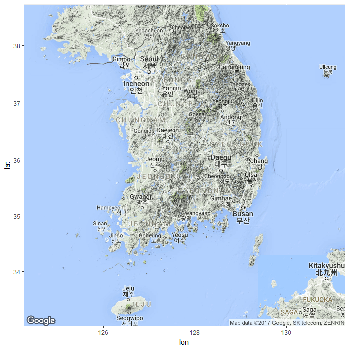 myLocation <- c(lon=128.25, lat=35.95) ggmap(get_map(location=myLocation, zoom=7))