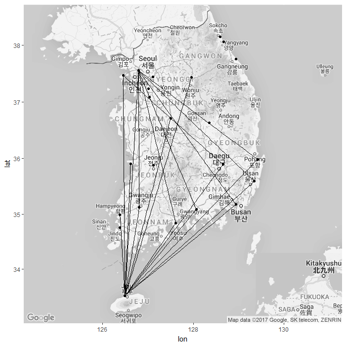p <- ggmap(map) + geom_point(data=airport, aes(x=lon, y=lat)) p + geom_line(data=route, aes(x=lon, y=lat, group=id))