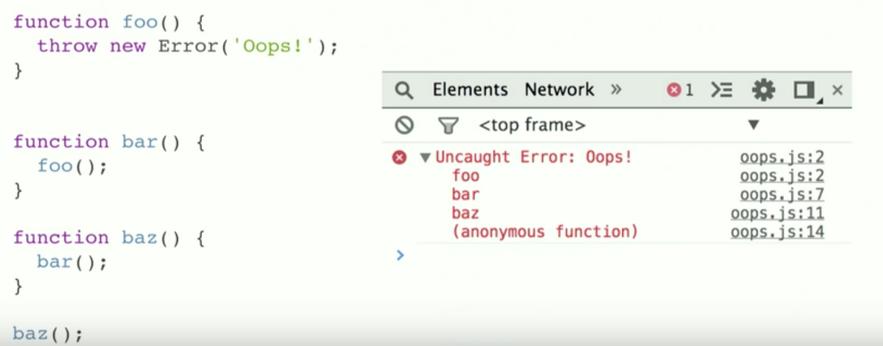 브라우저 콘솔에서 가끔 긴 빨간색 에러 스택들을 본 기억이 있을 것입니다. 보통 그것들은 콜스택의 현재 상태를 나타냅니다. 그리고 실패한 함수를 스택처럼 top부터 bottom까지 나타내는 거죠.