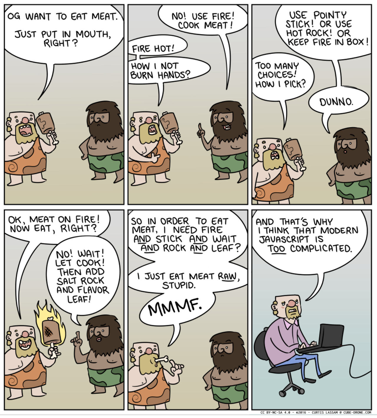 자바스크립트 환경(ecosystem)은 그 어느 때보다 복잡해졌고 앞으로 더욱 복잡해질 것입니다. 현대적인 모바일 웹앱을 만들기 위해 요구되는 것은 너무나 많습니다. 웹팩, 바벨, ESLint, Mocha, Karma, Grunt ... etc... 우리는 무엇을 사용해야 하고 이 많은 툴들은 무슨 일을 하는 걸까요? 저는 현대 웹 개발자들이 겪고있는 어려움을 완벽히 그려낸 이 웹툰을 찾았습니다.