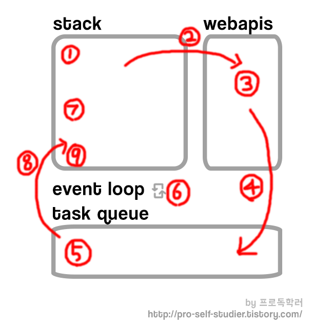 2. 실행 도중 비동기 처리가 필요한 코드가 있으면 webapis로 넘기고 stack에서는 코드를 계속 실행합니다.
