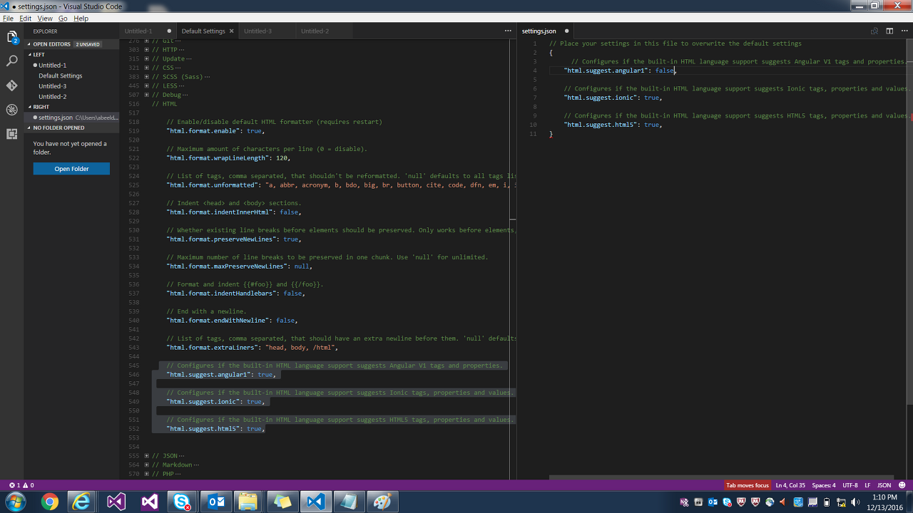 // Configures if the built-in HTML language support suggests Angular tags and properties. "html.suggest.angular1": false, "html.suggest.ionic": false, "html.suggest.html5": false,